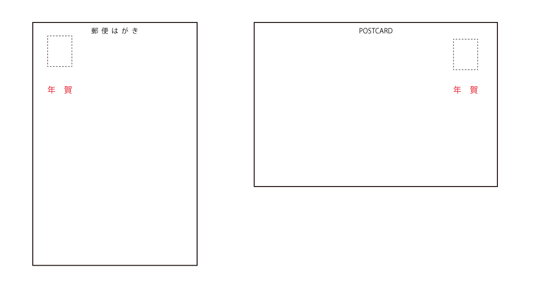 - 必ず切手の下に「年賀」と朱色で表記します。「年賀」と朱記されていない場合、一般郵便物とみなされ年内に配達されてしまいますので注意が必要です。年賀切手も販売されていますので、私製はがきを利用する場合は年賀切手の使用をおすすめします。また、郵便はがきとしてデータを作成する場合、宛名を書く表面には「郵便はがき」と記載しなければなりません。英語表記の場合は「POSTCARD」となります。この記載がなければ手紙として扱われ、郵便料金は定型で85円となりますのでご注意ください。
