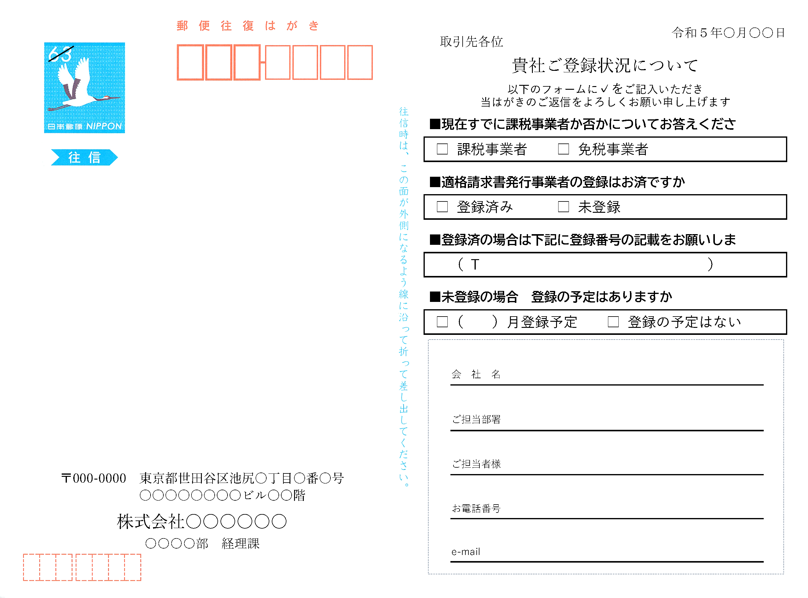 郵便局発行の官製往復はがきです。弊社よりご購入いただけます。(1枚:126円)